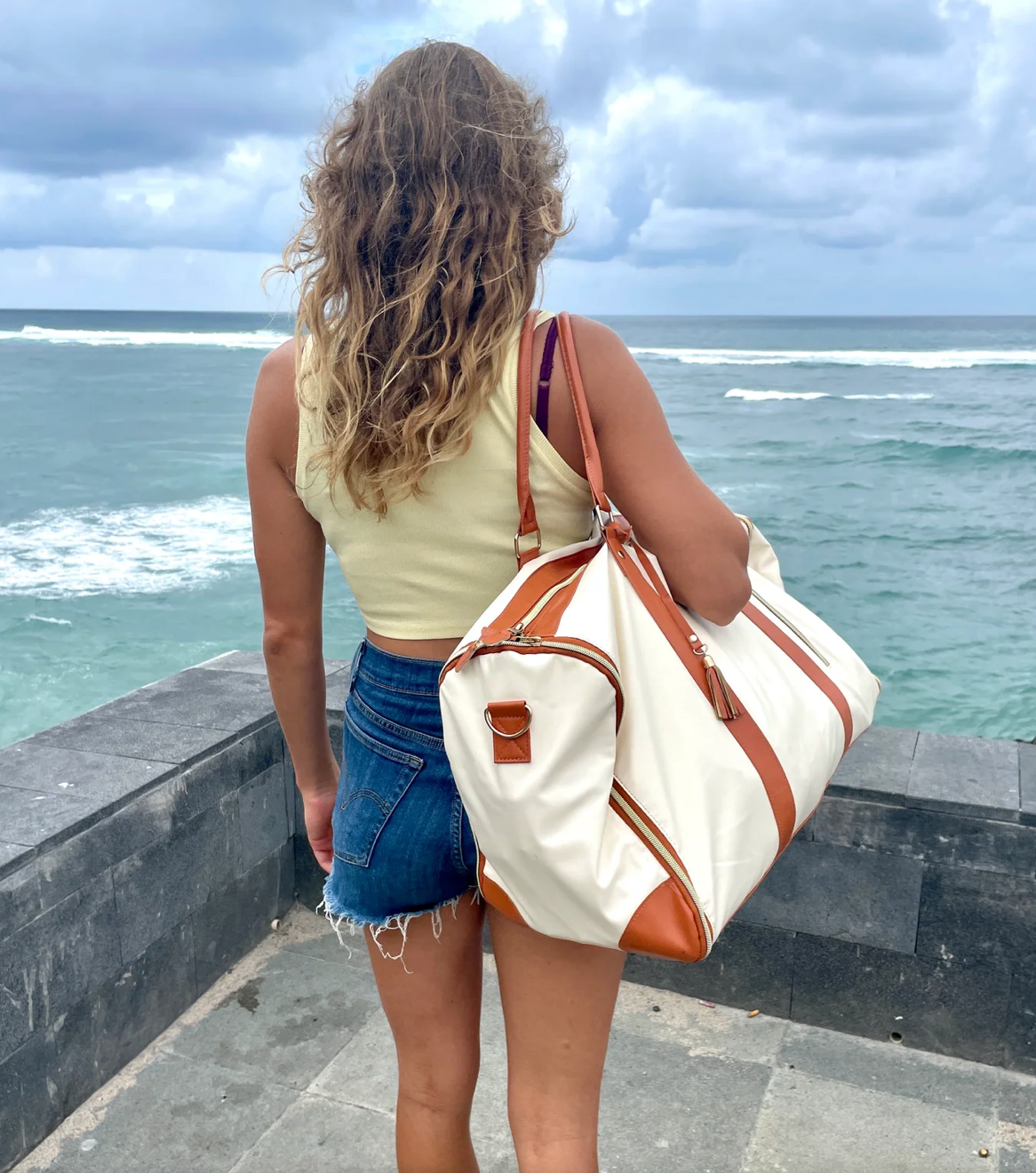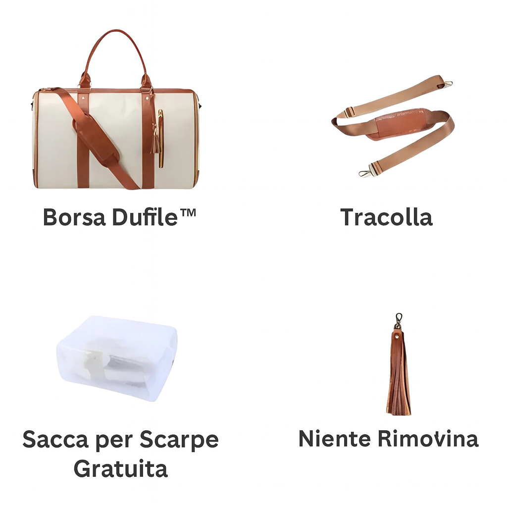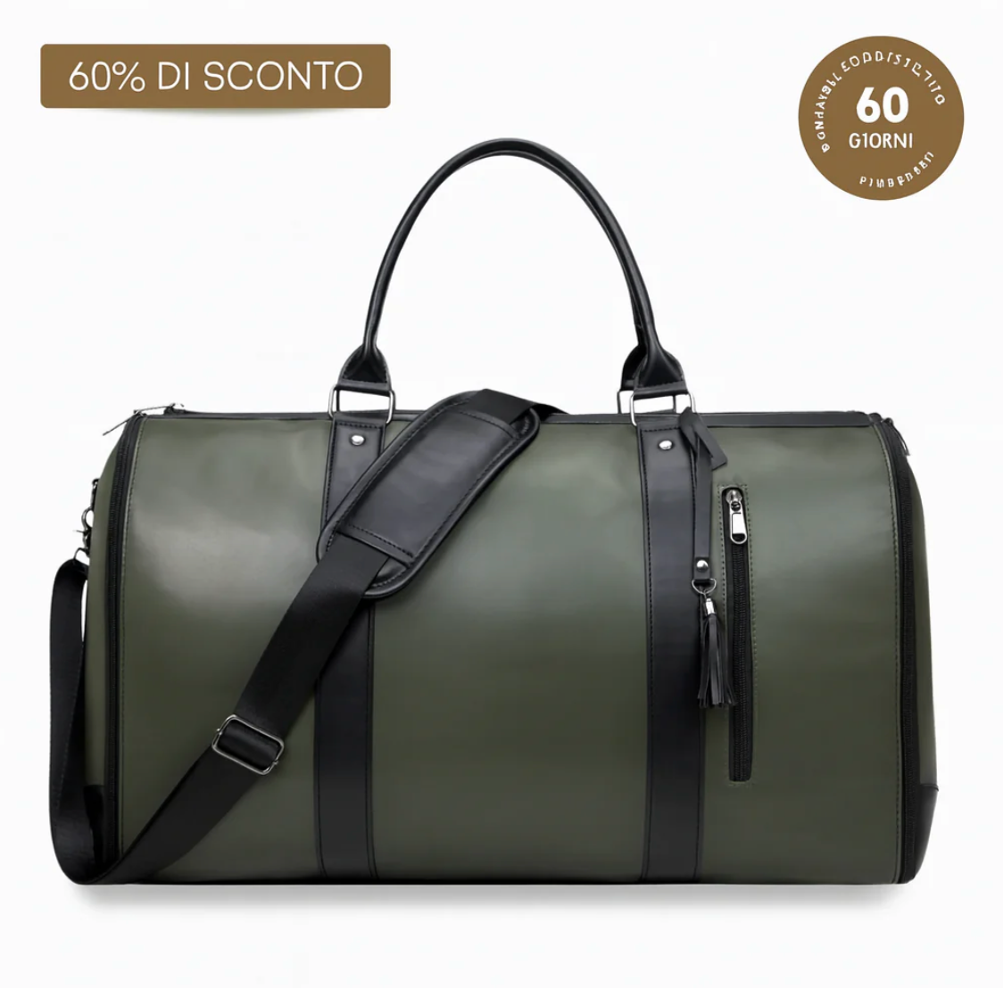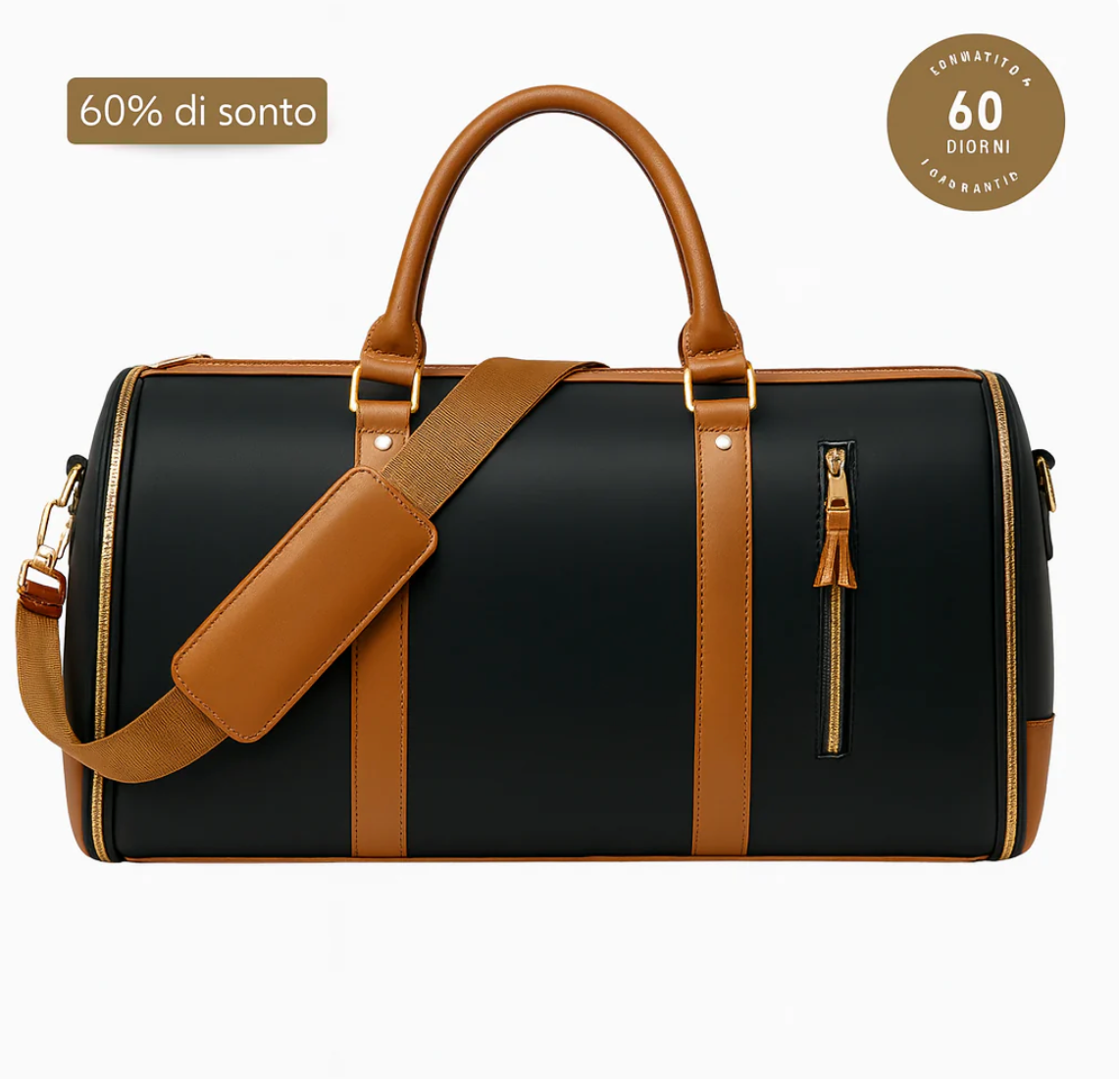 La borsa offre un ampio scomparto principale, 2 tasche interne piΓΉ piccole per lβorganizzazione, un vano piatto per i vestiti e una tasca esterna pratica per accedere rapidamente agli oggetti importanti.